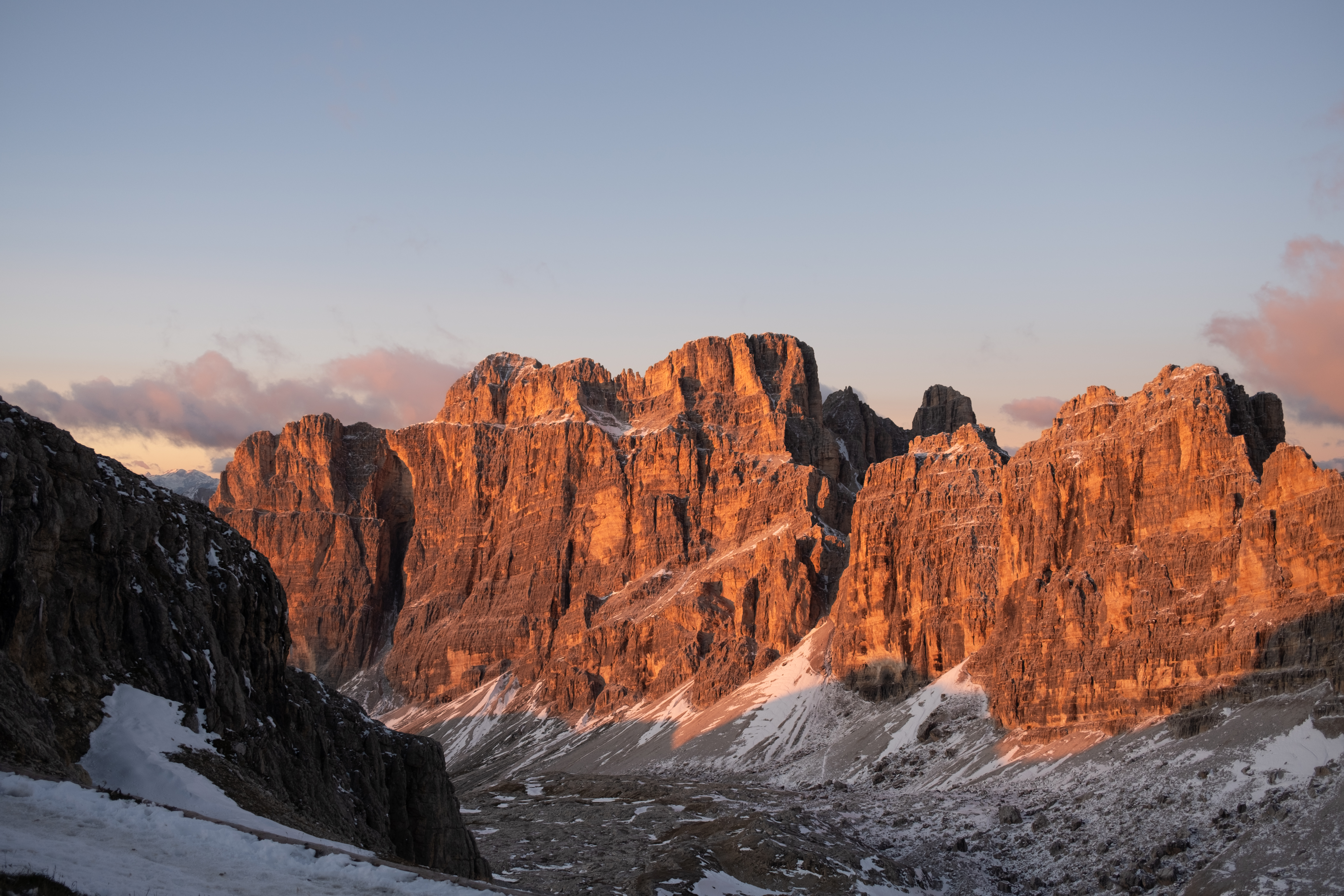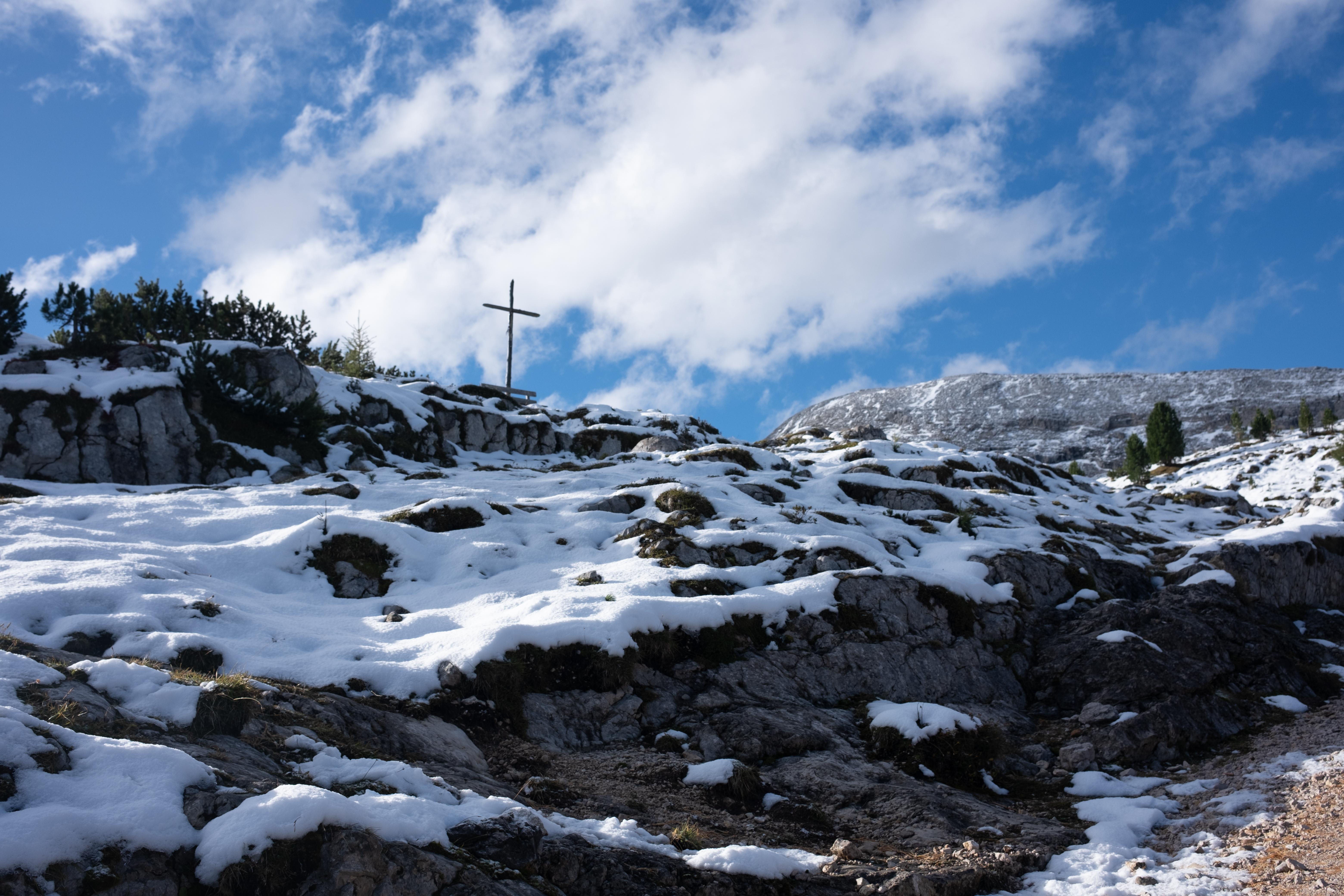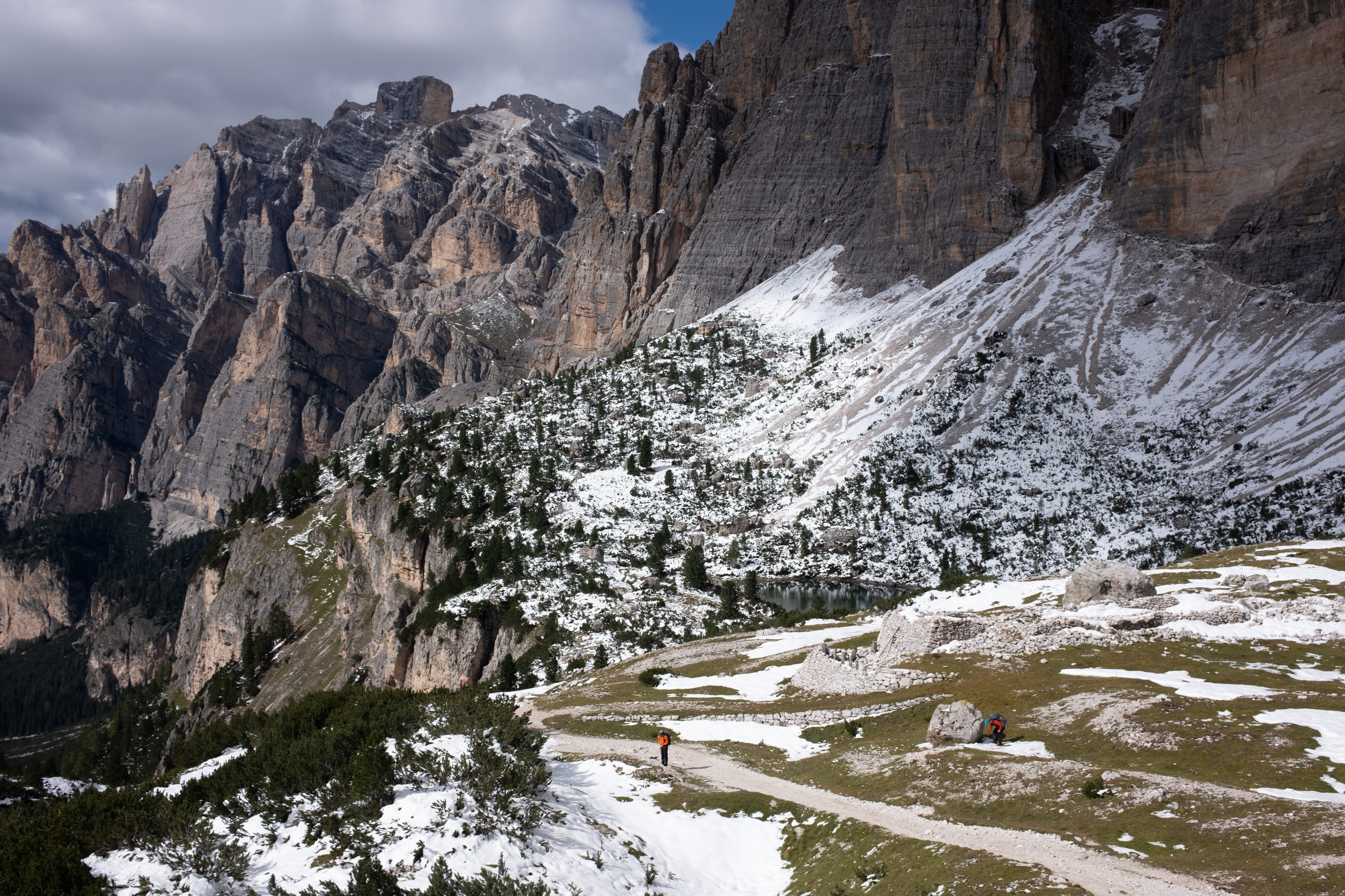 I've had days like this before—on the Camino, on the Fishermen's Trail—where distance seems to stretch like rubber bands. At this point, I knew that I'd get to Lagazuoi at the end of the day, and I could see Lagazuoi in sight but it seemed so unreachable. There was still one final climb to do: a zigzag past World War bunkers, made trickier by snow, forced me to strap on my spikes again after nearly a whole day without them.