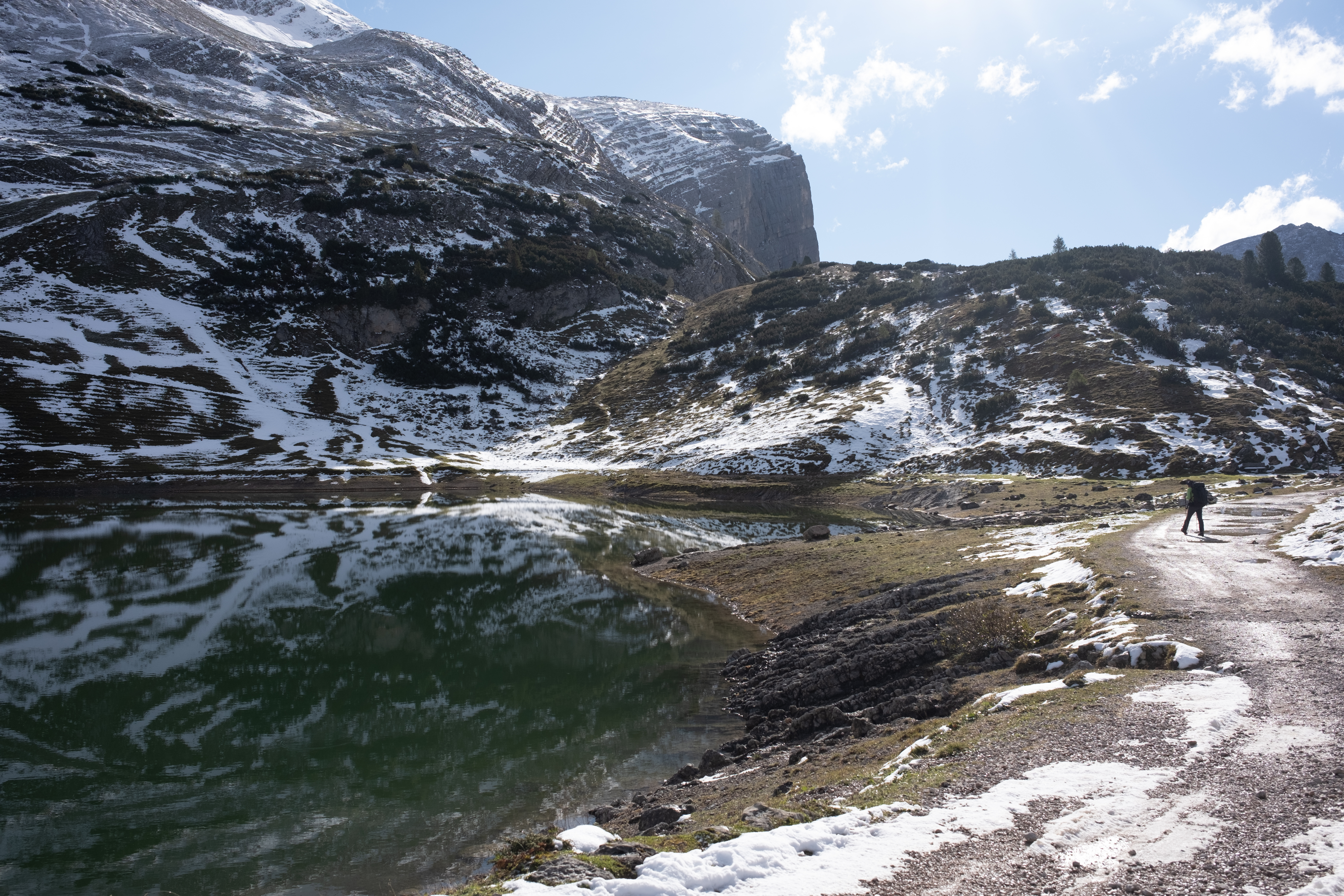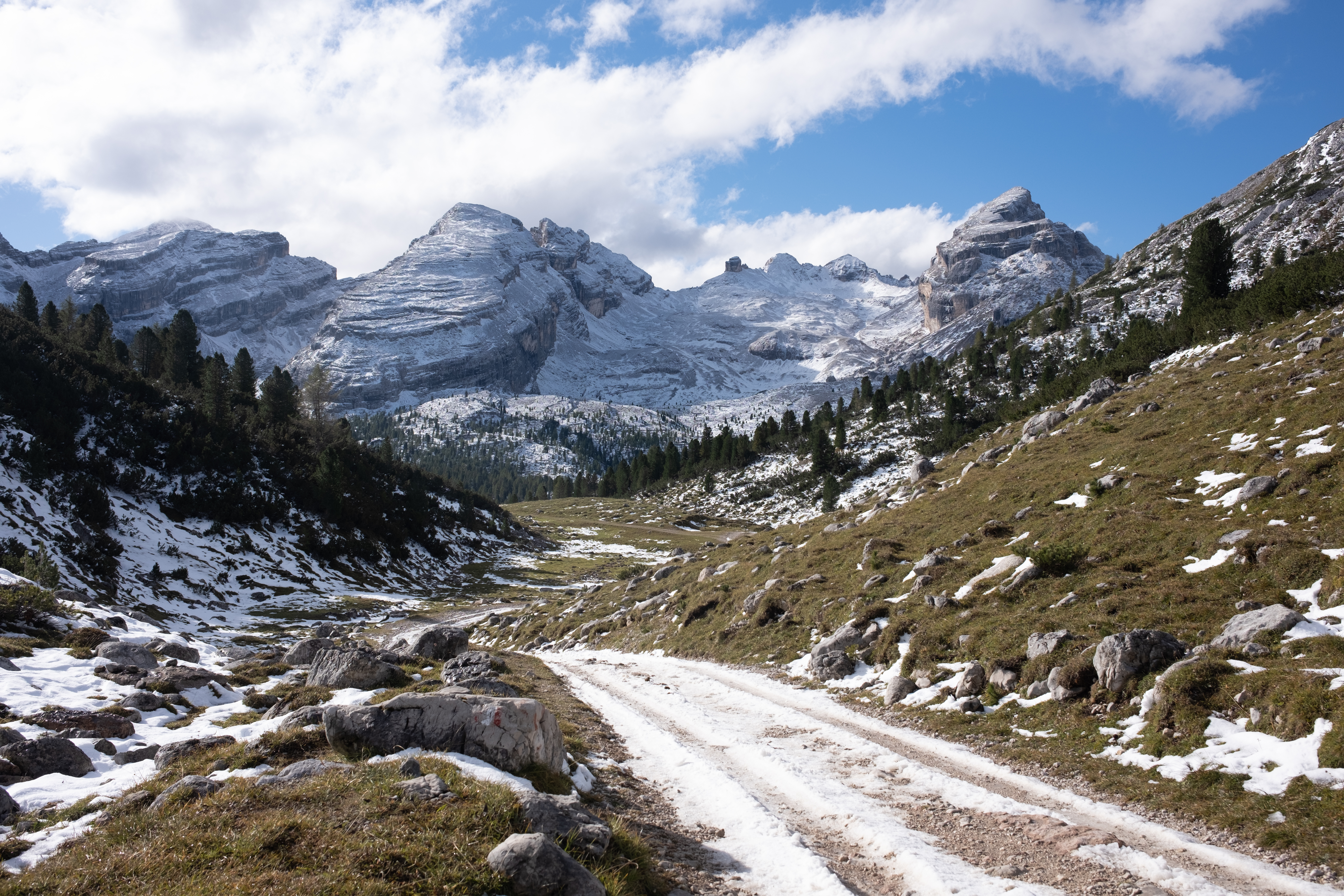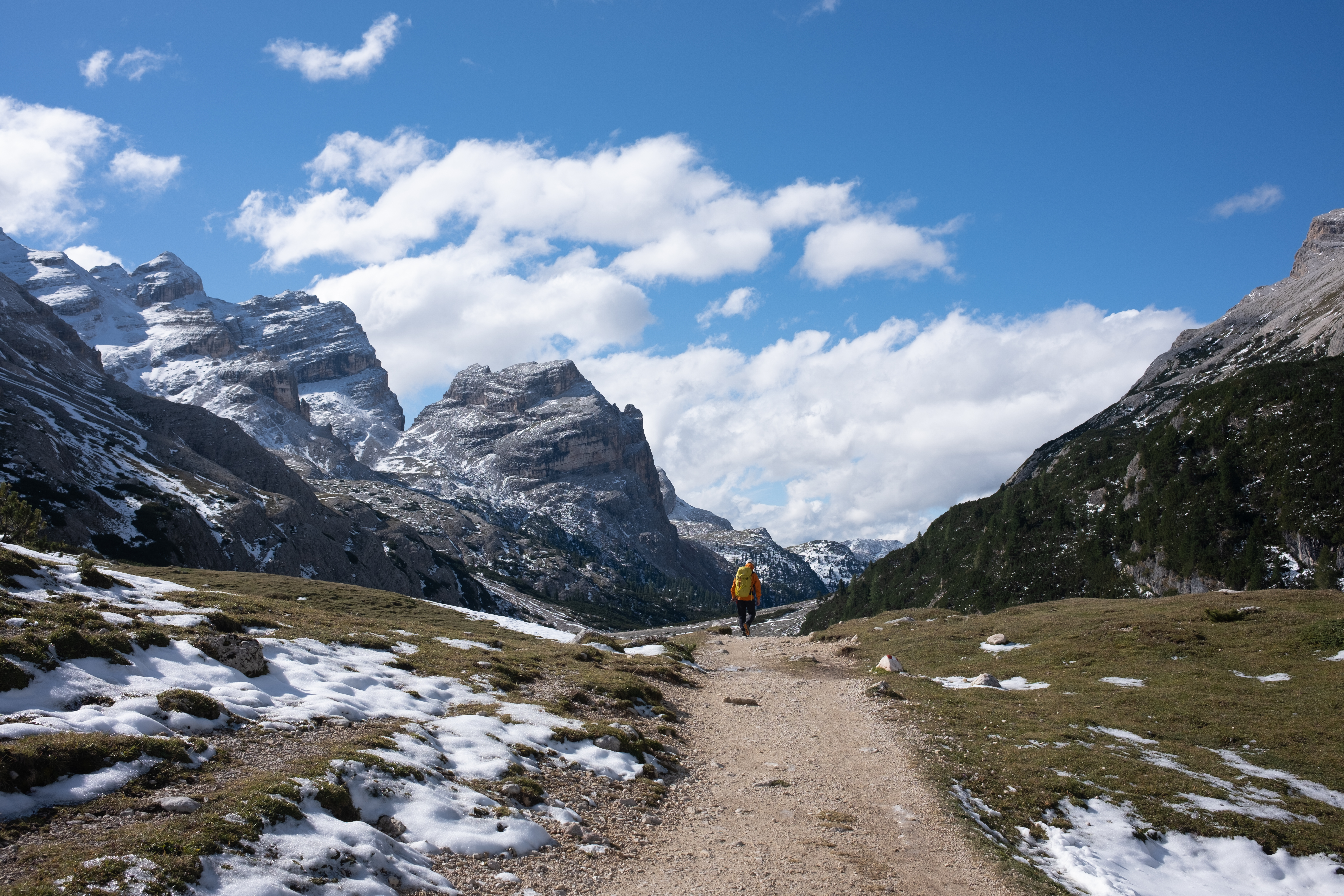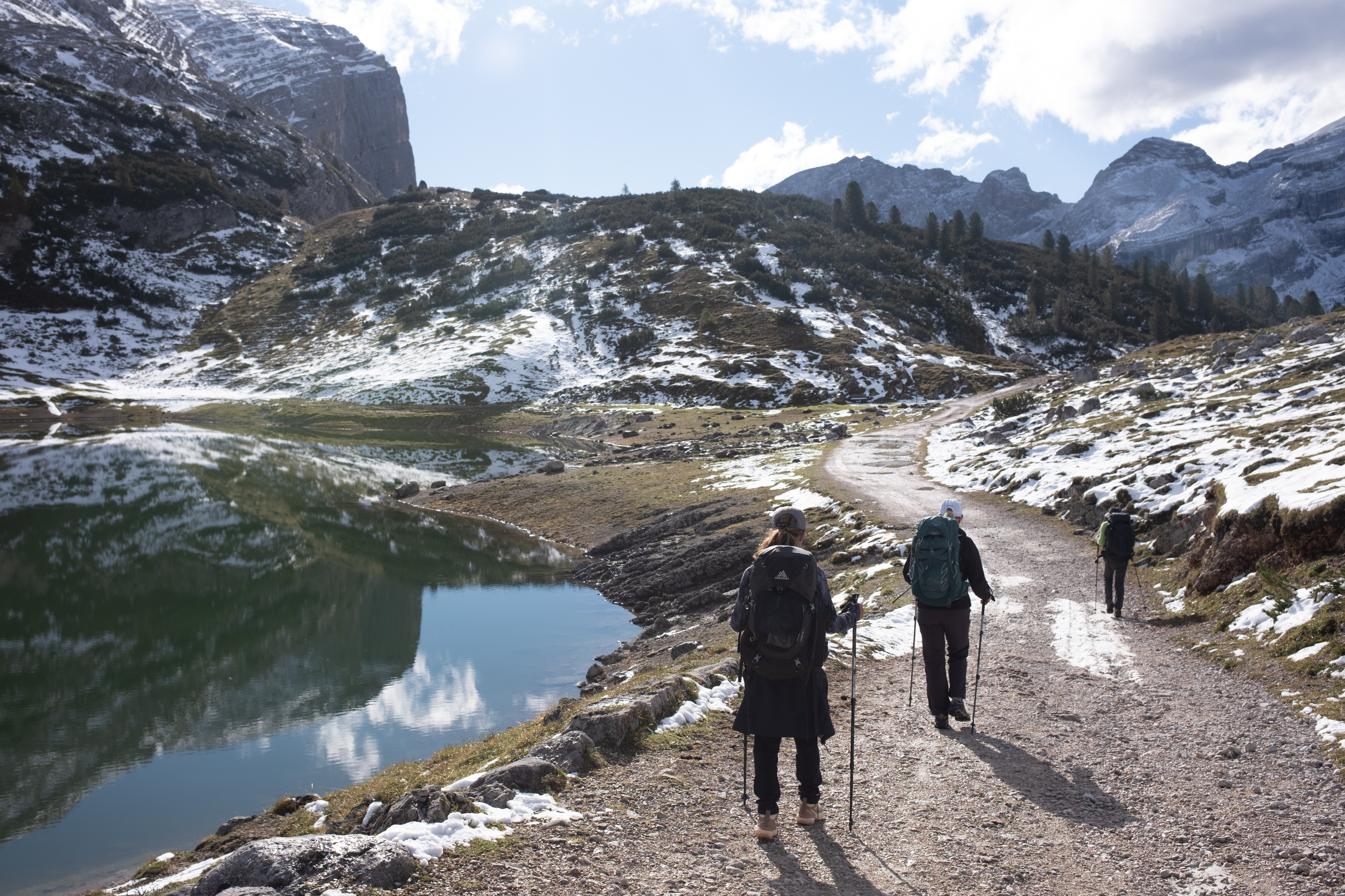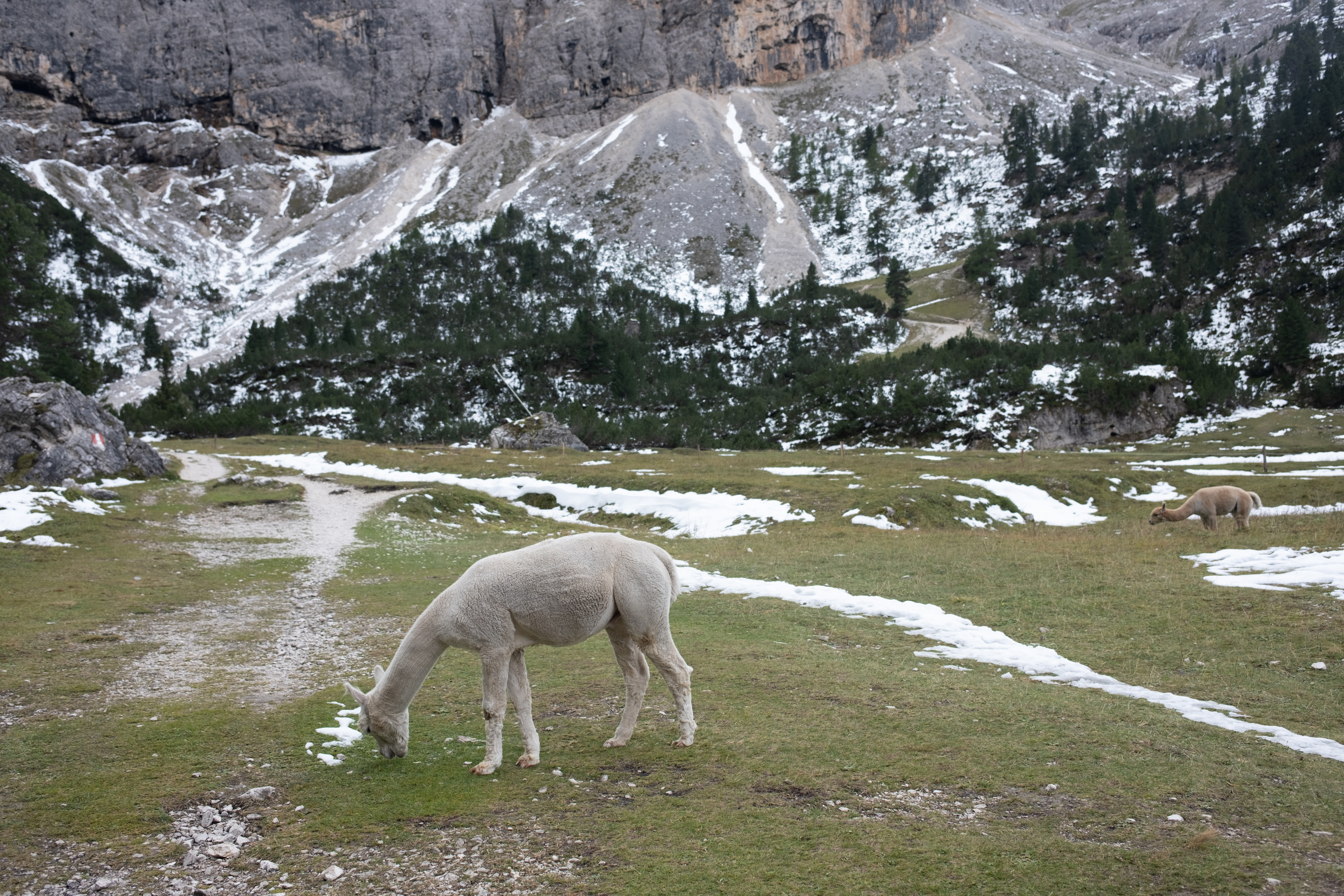 The morning felt magical. My legs found their rhythm, carrying me through exactly the kind of scenery that I signed up for when I decided to hike the Dolomites: peaks with jagged edges softened by spring meadows emerging from the melting snow. We even passed grazing cows and, surprisingly, llamas lounging in the valley. We decided to take a detour this time—my guidebook says that it would probably take us an extra 15 minutes—to avoid the regular path towards Forcella del Lago that would be dangerous because of the snow.