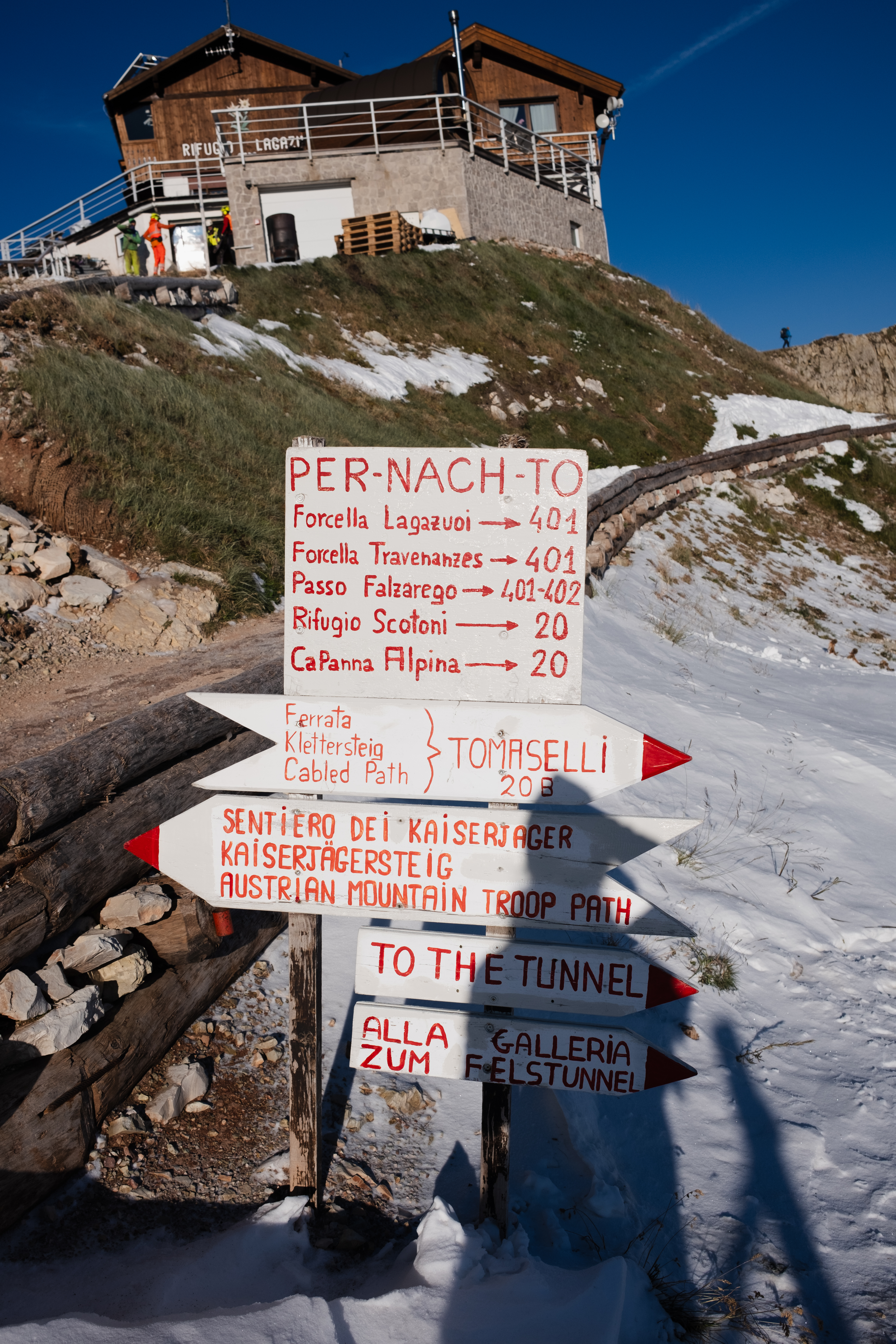 My morning optimism led to an early start, and unfortunately also a wrong turn. Convinced I knew where the cable car station was, I retraced yesterday's zigzagging path downhill. The trail was even icier than before, and it took nearly a kilometer of careful footwork to realize my mistake: the station was actually right beside the rifugio. The detour wasn't entirely wasted though. Walking back up, I took time to look at the World War I tunnels I'd missed yesterday, remnants from when Cortina d'Ampezzo was located right at the southern edge of the Austro-Hungarian Empire, making it a prime location for the Italians to advance.