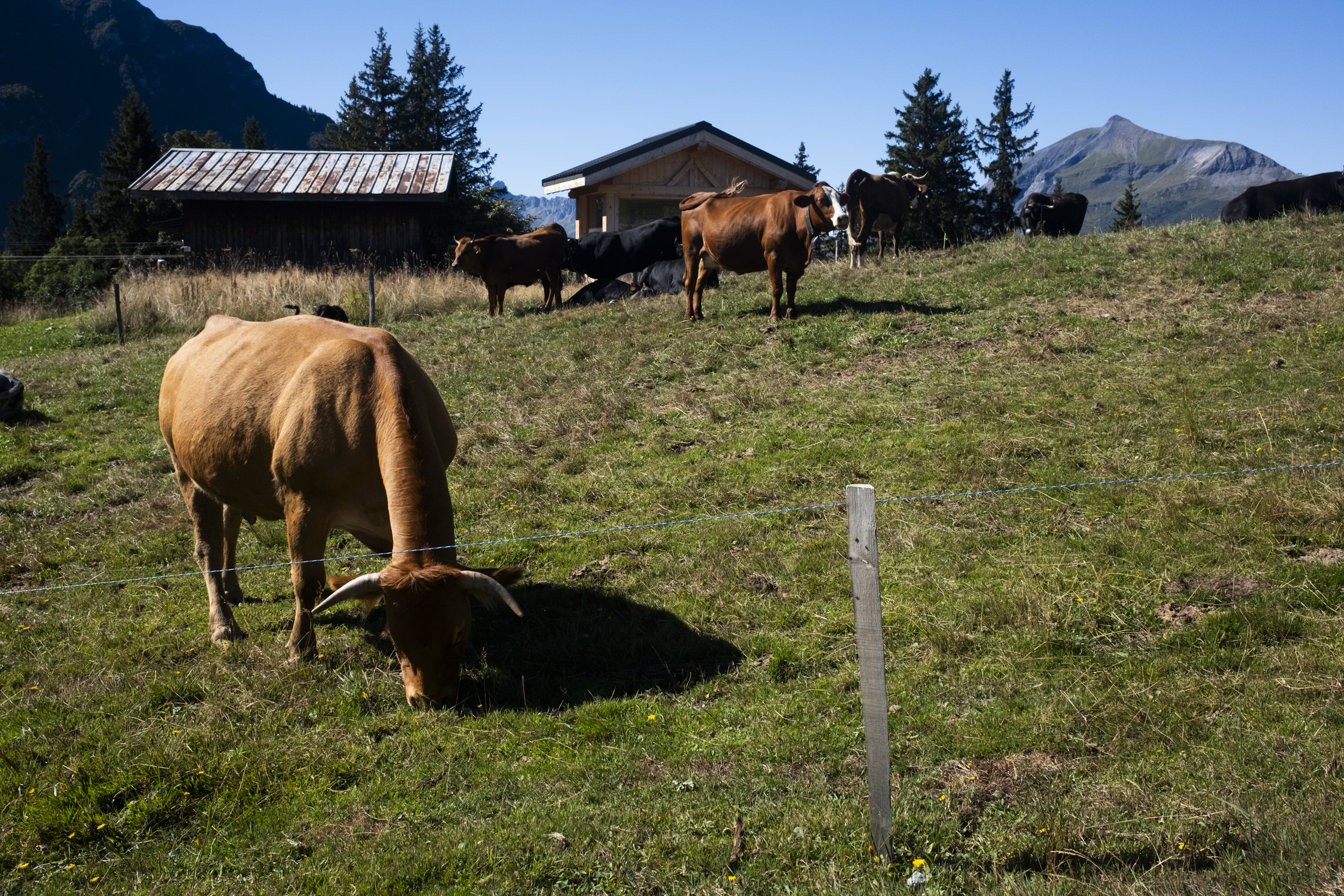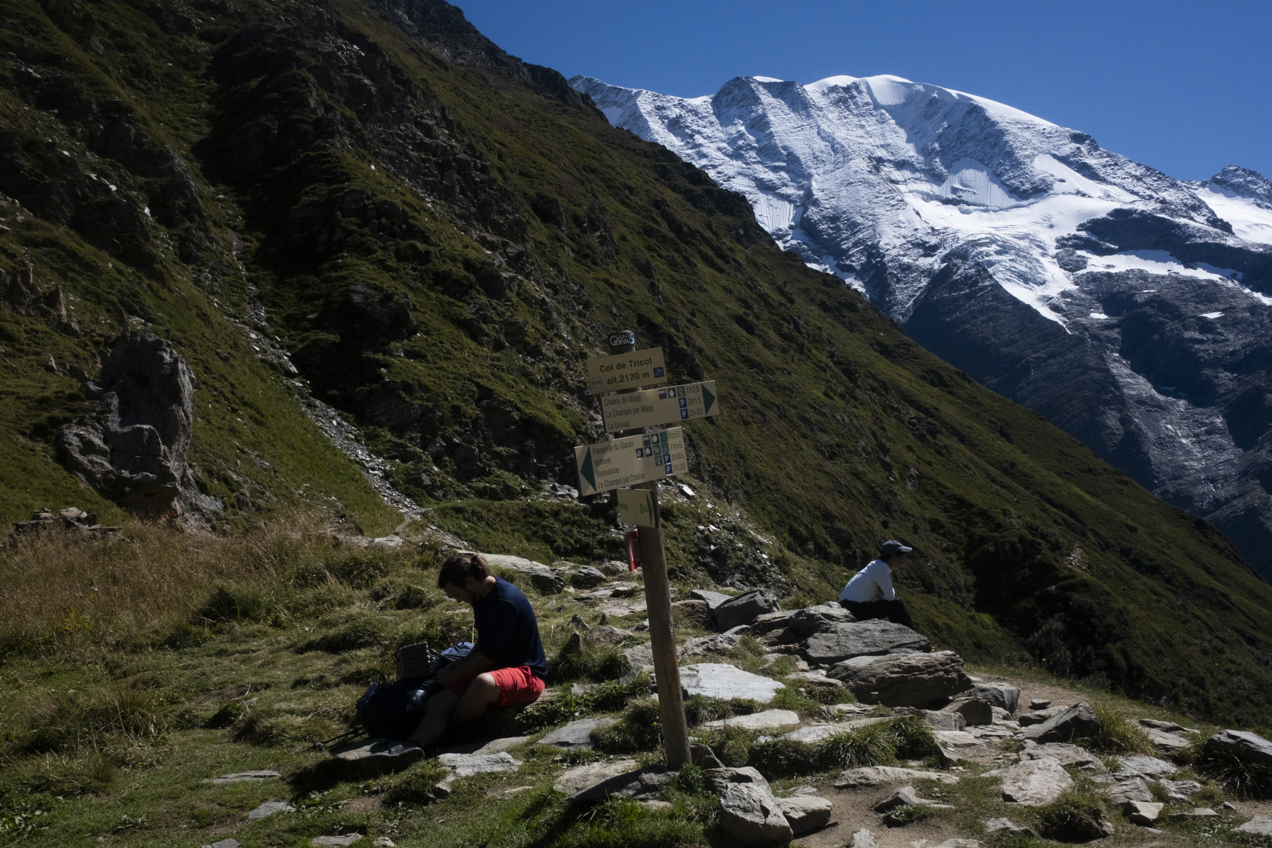 And boy oh boy did it make an intense first day. At this point I thought I had gotten used to hiking again, but then I had totally forgot how to manage steep climbs when it was scorching hot: every step felt like a pain and my heart rate shot up high. It took us a while to get to our first col of the hike, at 2120 m. We took the opportunity to take another break here, where I also recognized some of the hikers we saw earlier at the bottom. It was still 1h 20m to Chalets de Miage, a rifugio we would be passing by but not sleep for the night. Technically Chalets de Miage was just down there, and we could see the valley from where we were sitting, the reason why it took us another hour was because it was a very steep descent with very sharp switchbacks that seemed to go on forever and were definitely not easy on the knees.