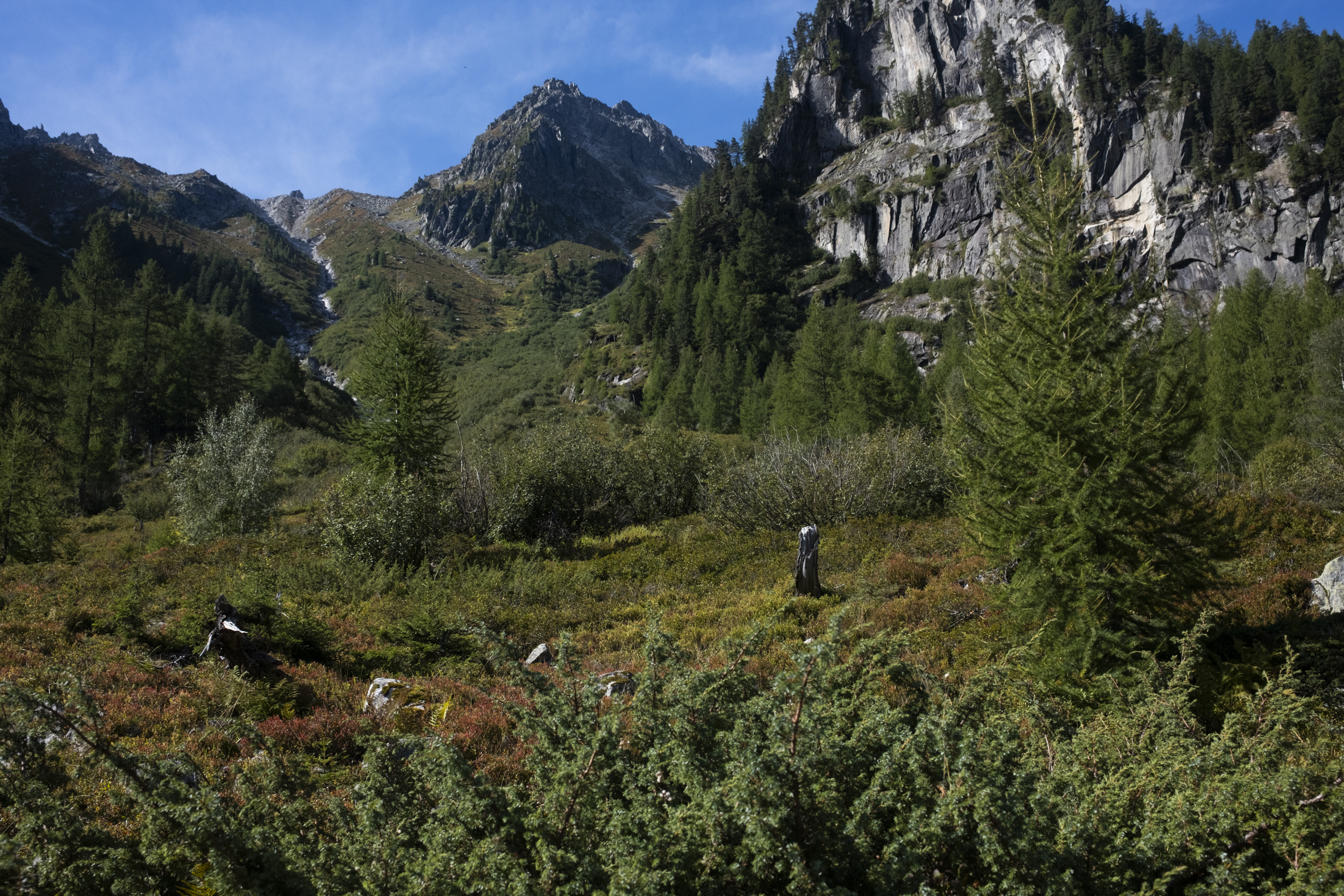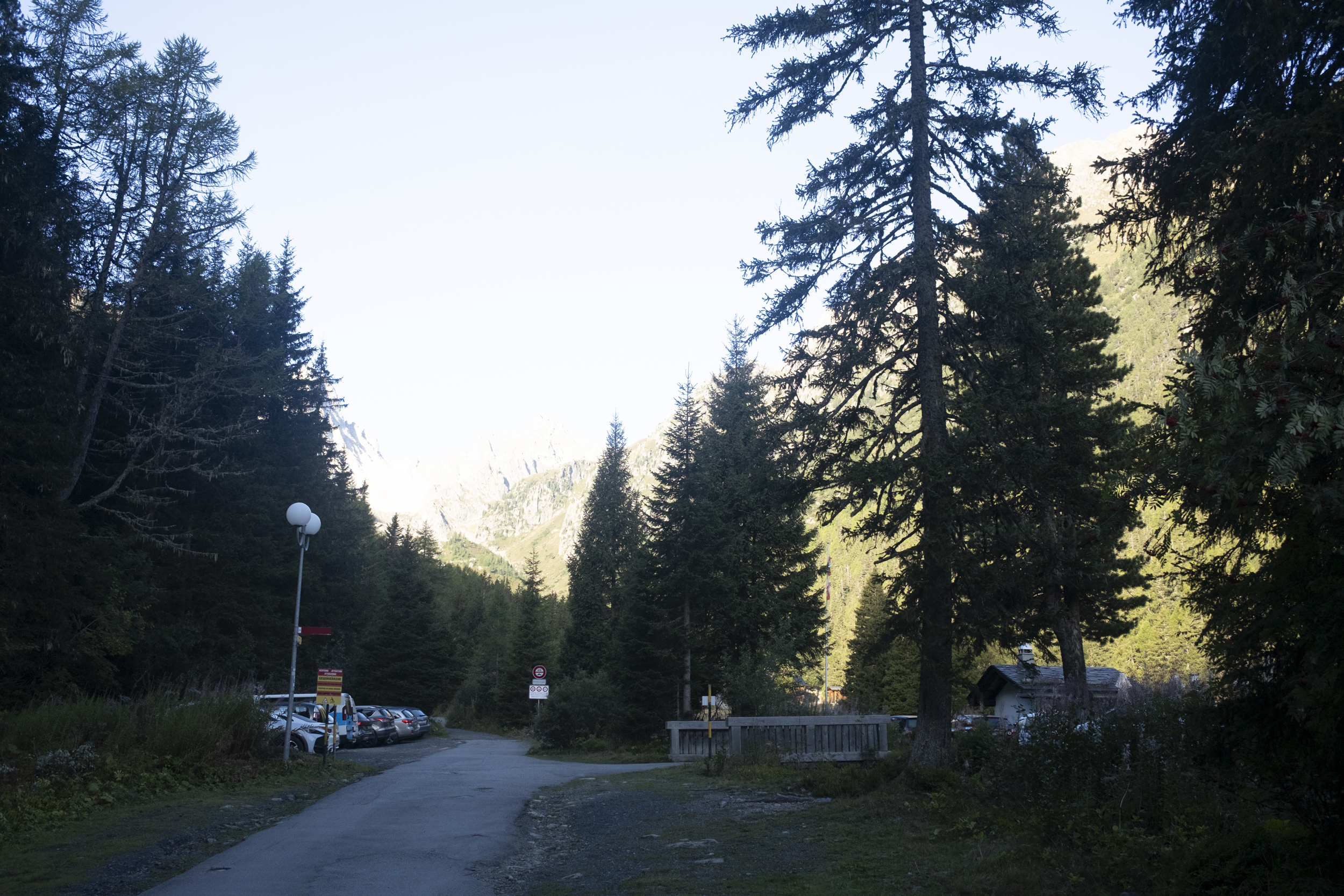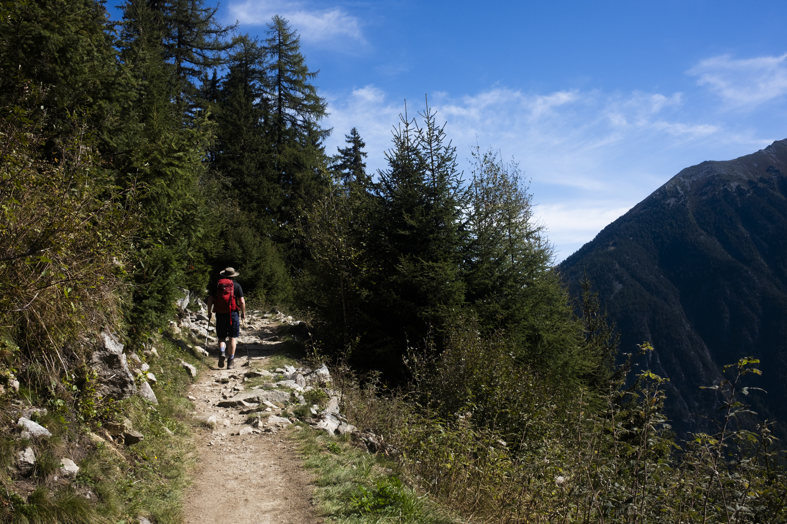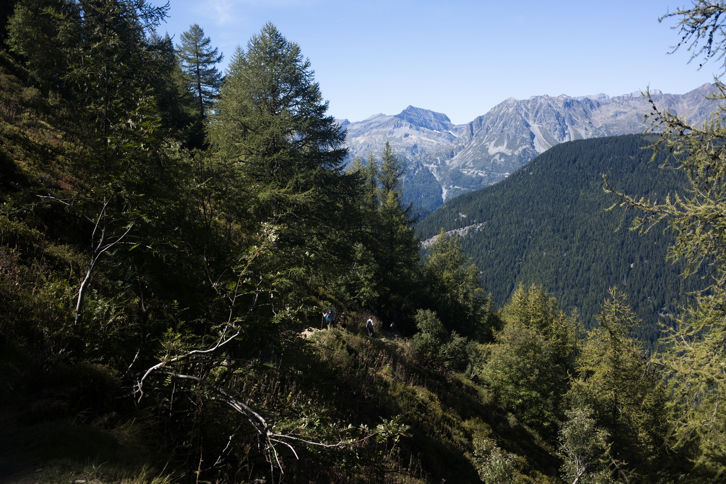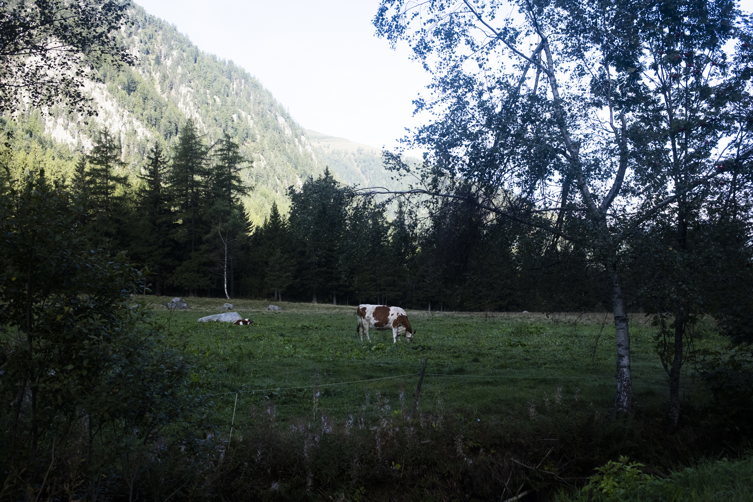 Since Relais d'Arpette lies on the Fenetre d'Arpette, to go through the Bovine route we had to backtrack a little bit to the main trail and then continued to descend to the valley. The first few kilometers were indeed mostly downhill. We passed one village or two, this time it seems they were larger villages than the ones we walked past yesterday, full of orderly wooden houses. Here I started to notice that there were so many people. Where did all of these people come from? Up until today I would usually recognize a face or two but now there were just multiple groups of people suddenly appearing out of nowhere, and this is the first time where I really felt that the trail was truly crowded. I thought this route would have been quieter since more people would have probably opted for the Fenetre d'Arpette route given that it was forecast to be dry for the entire day. Even the Dutch trio also told us they were going to do the Fenetre d'Arpette route.